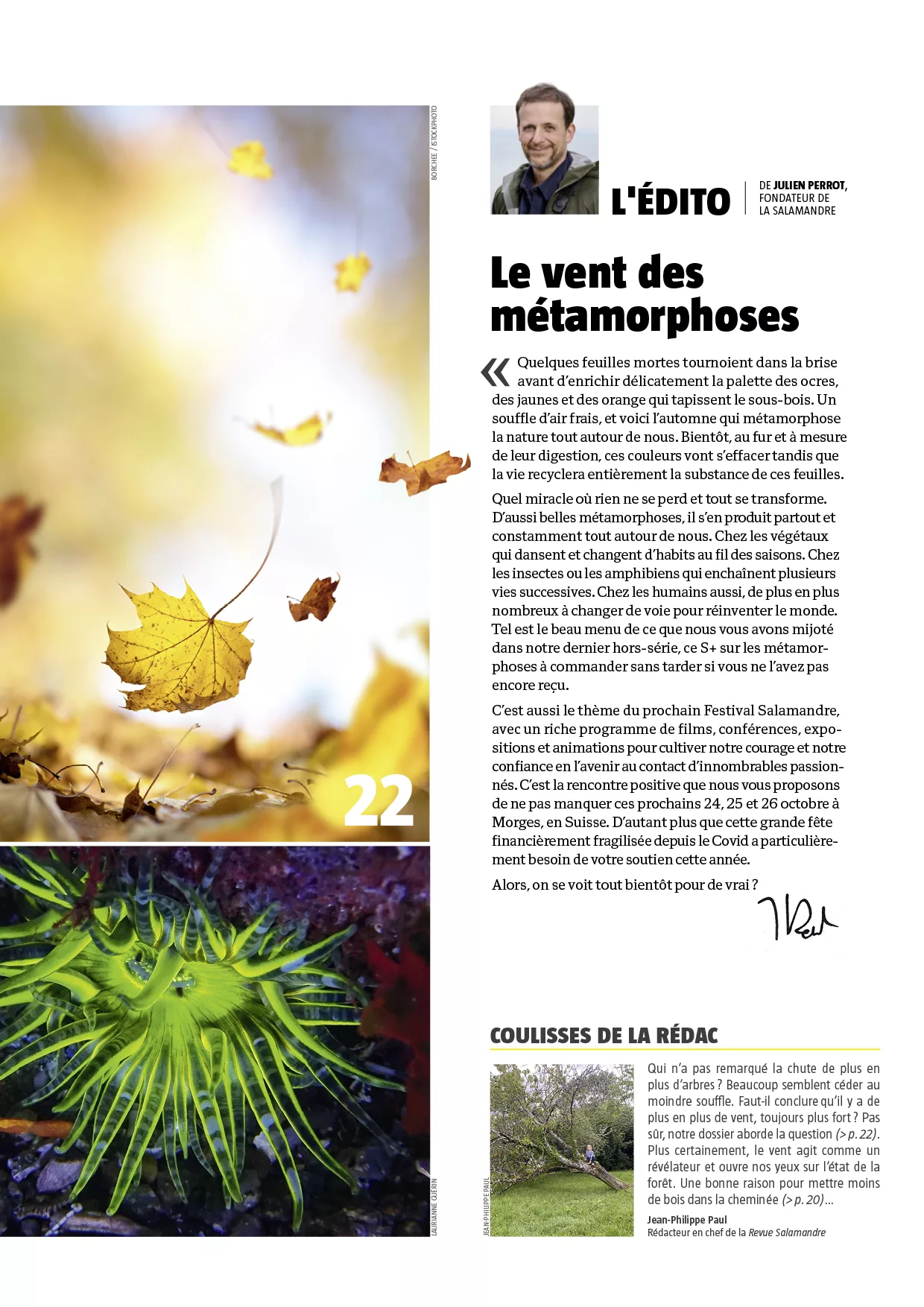 Et pour ceux qui n’aiment pas être décoiffés, ce numéro automnal rend visite aux paisibles phoques qui s’allongent nonchalamment sur les plages normandes ou encore au troglodyte, minuscule oiseau hyperactif qui explore méticuleusement les buissons. Bonne lecture !